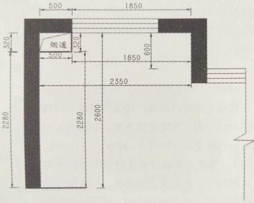 “L字型”布局櫥柜的測量工況圖,櫥柜左右兩邊靠墻,下部則不靠墻,所以定位尺寸為煙道長寬(500mm×320mm)和臺面一個方向的長度(2660mm),其他則為定形尺寸(600mm、1850mm、2280mm)。