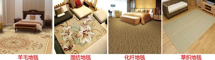 3、化纖地毯:化纖地毯也較合成纖維地毯,耐磨性好且富有彈性,價格較低;